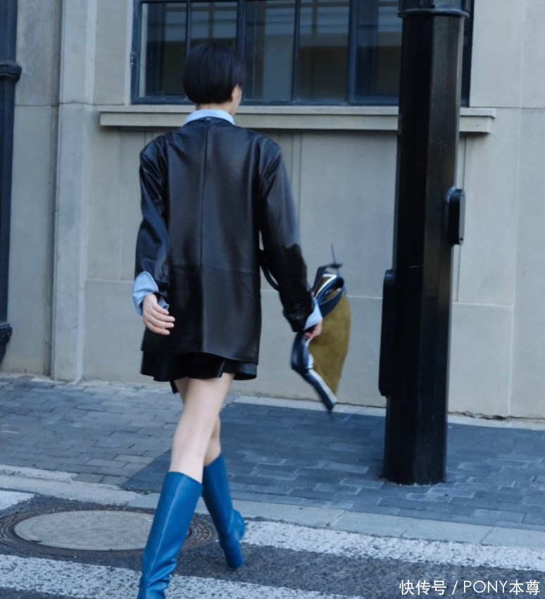 黑色长袖皮裙,短款设计是显高神器!一头英姿飒爽的吴越内搭一件衬衫,时尚摩登指数五颗星!搭配这件短款连衣裙的,是一件蓝色长筒靴!